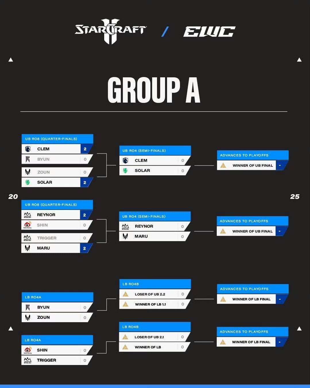央视网消息:北京时间7月23日凌晨,在2025年EWC电竞世界杯《星际争霸2》项目中,中国赛区两位选手 WBG.Shin 与 JDG.Cyan 均在胜者组四分之一决赛中告负,跌入败者组。其中,A组的 WBG.Shin 以 0:2 不敌 Basilisk.Reynor;B组的 JDG.Cyan 同样以 0:2 负于 TM.Hero。